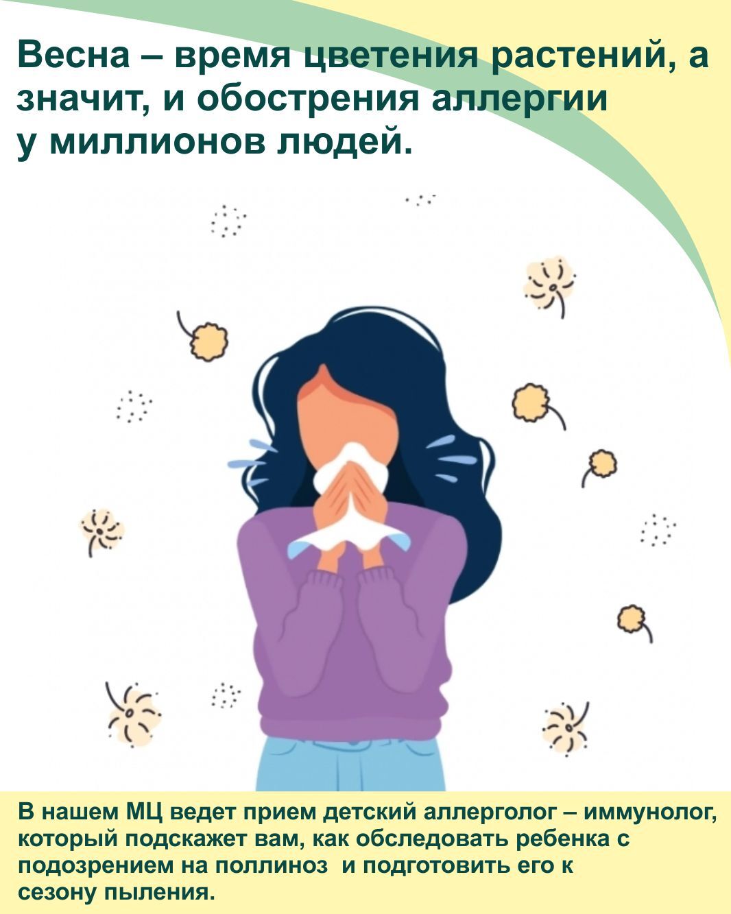Причина сезонной аллергии – поллиноза - кроется в пыльце растений, которая разносится ветром на десятки километров. Попадая в дыхательные пути, она вызывает бурную реакцию иммунной системы у людей, склонных к аллергии. Выявить точный аллерген можно с помощью анализа крови на специфические аллергены. Эти исследования позволяют скорректировать лечение и заранее подготовиться к началу цветения.В нашем МЦ ведет прием детский аллерголог – иммунолог, который подскажет вам, как обследовать ребенка с подозрением на поллиноз и подготовить его к сезону пыления.